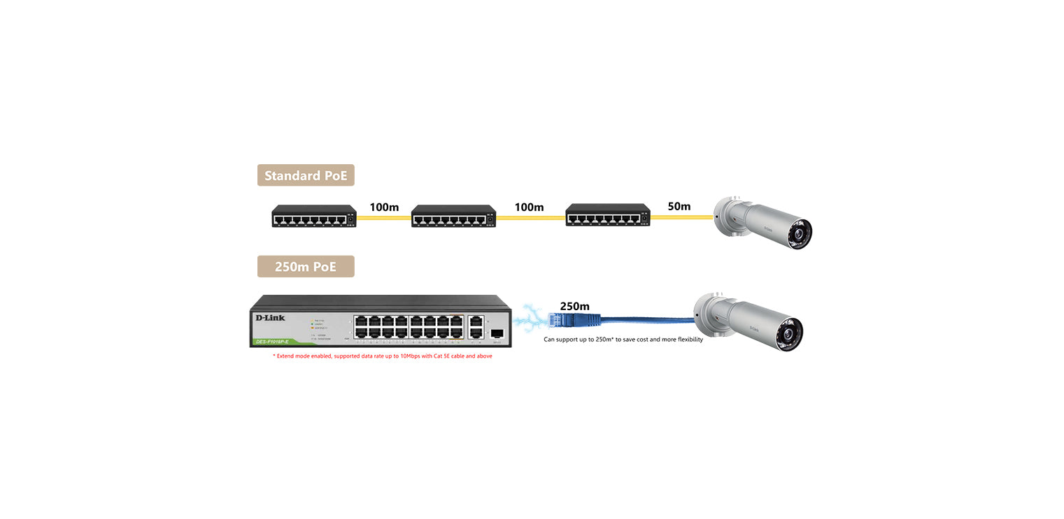 Support transmission Data/PoE up to 250m cable length (Port 1-14 with Extend enabled)