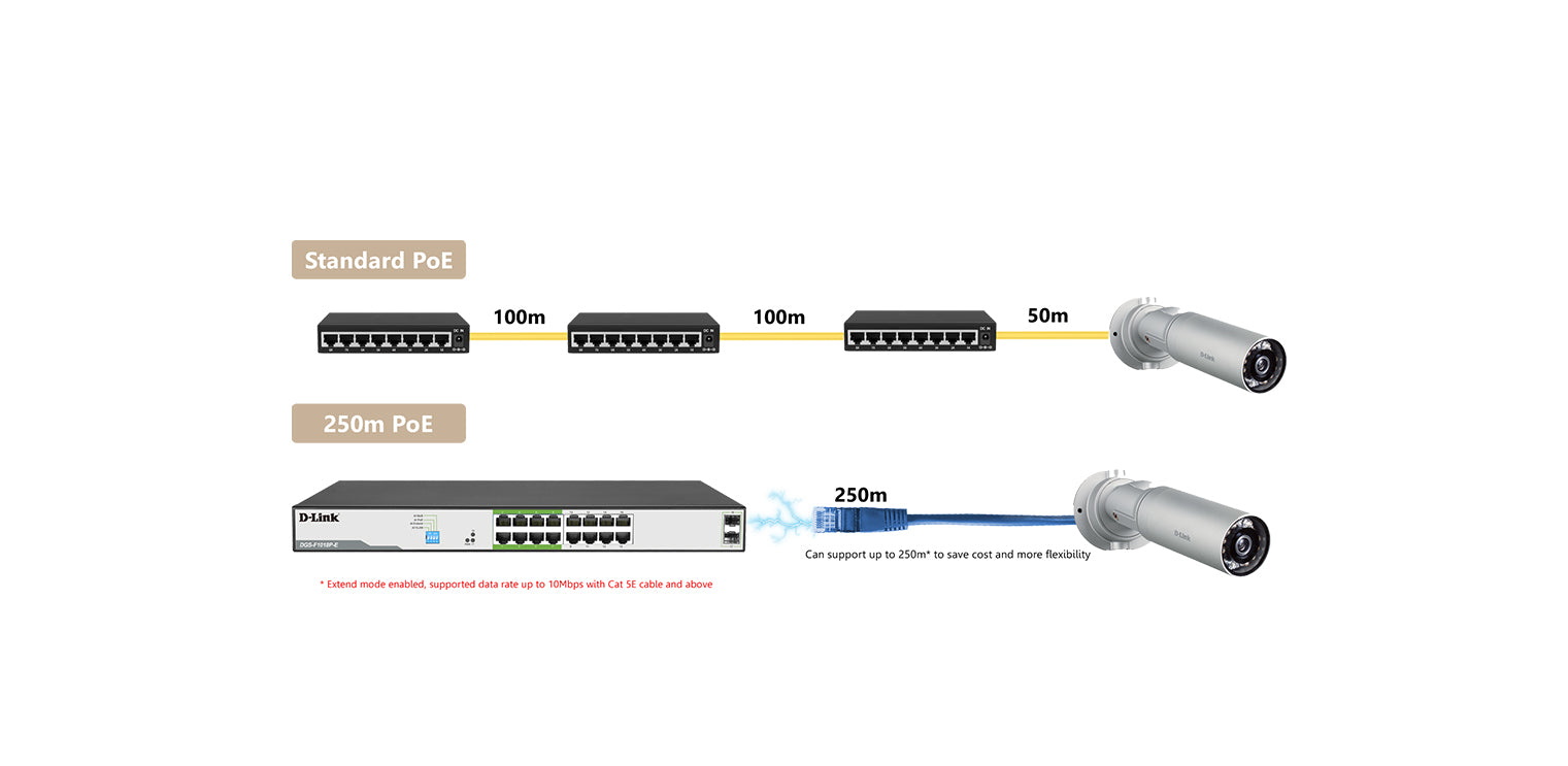 - • Support transmission Data/PoE up to 250m cable length (Port 1-8 with Extend enabled)