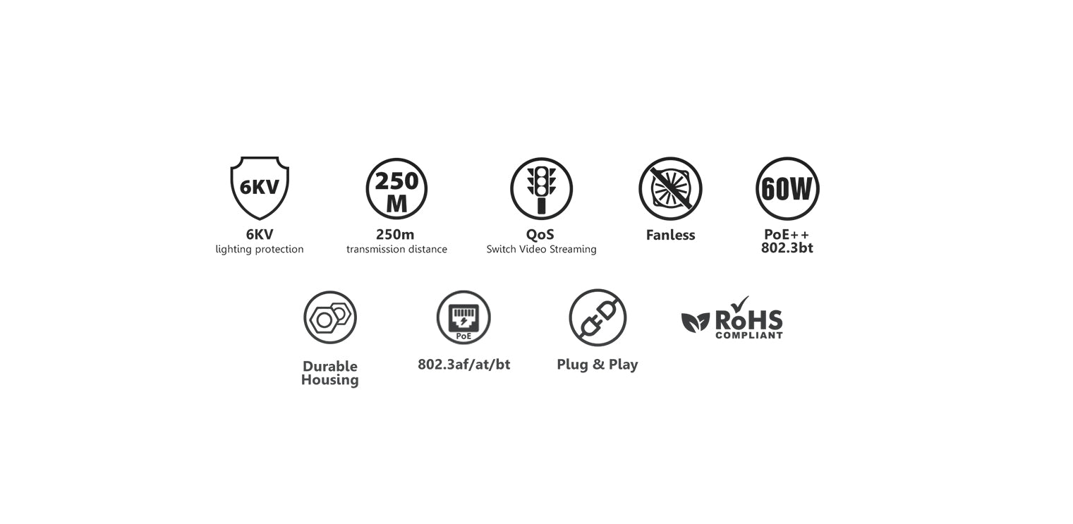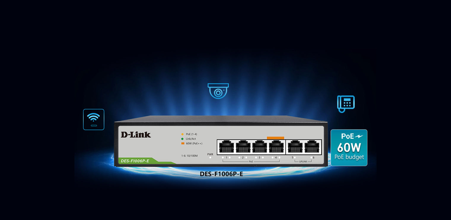 250M 6-port 10/100 switch with 4 PoE Ports and 2 Uplink Ports