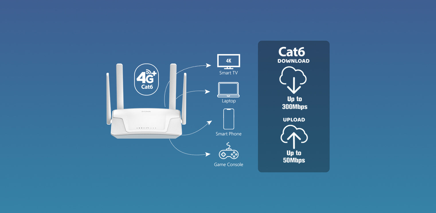 4G+ Cat 6 Connectivity1: up to 300 Mbps download and 50 Mbps upload over 4G LTE/3G networks with Cat 6 support for fast and reliable Internet access