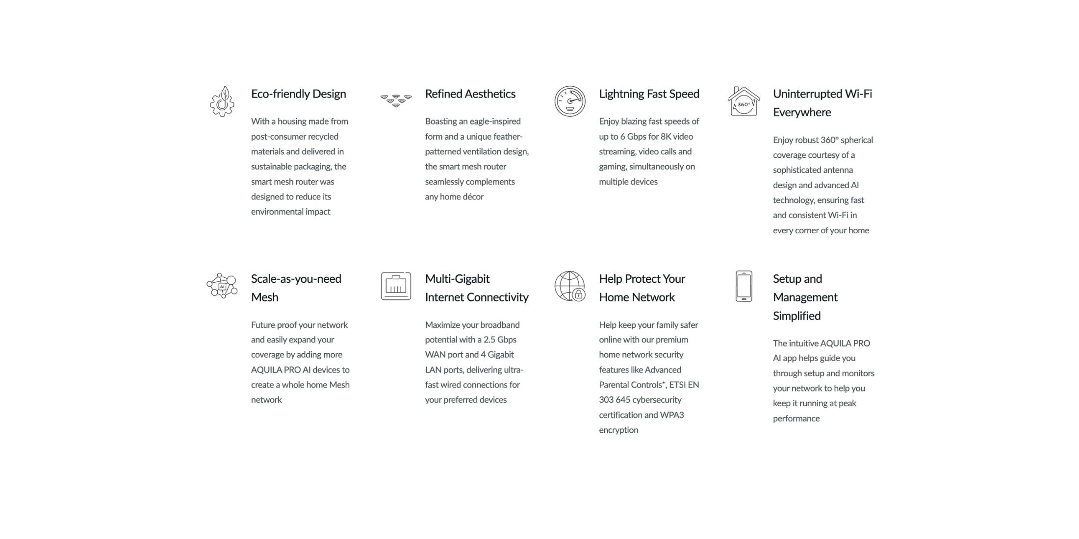 - Grow-as-you-need Mesh – Create a robust mesh network with other AQUILA PRO AI routers and extenders