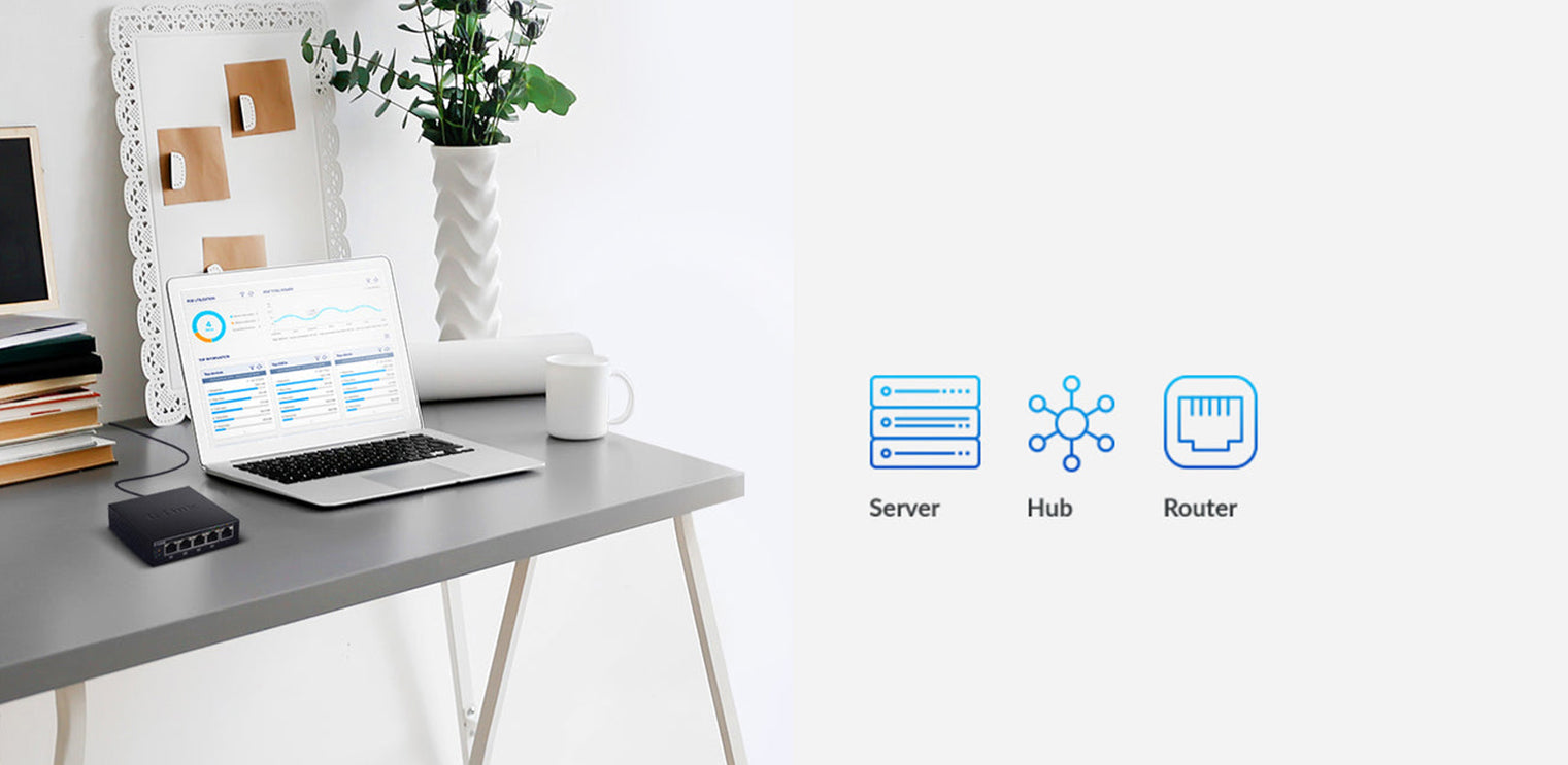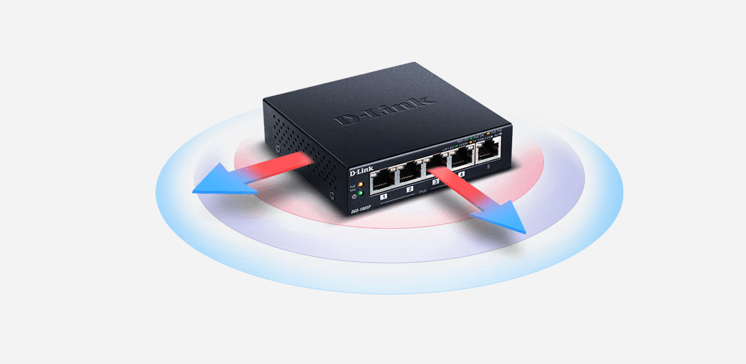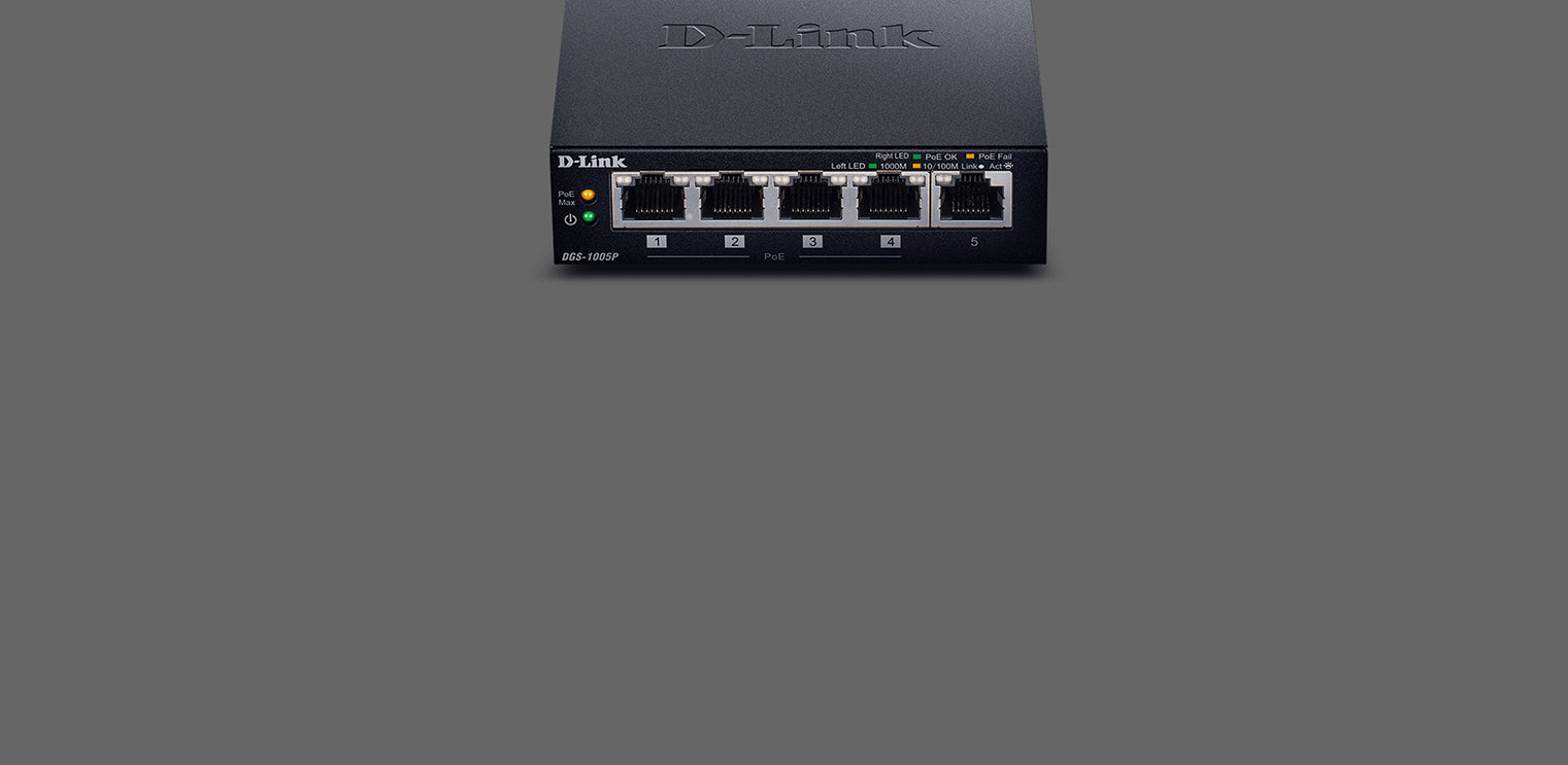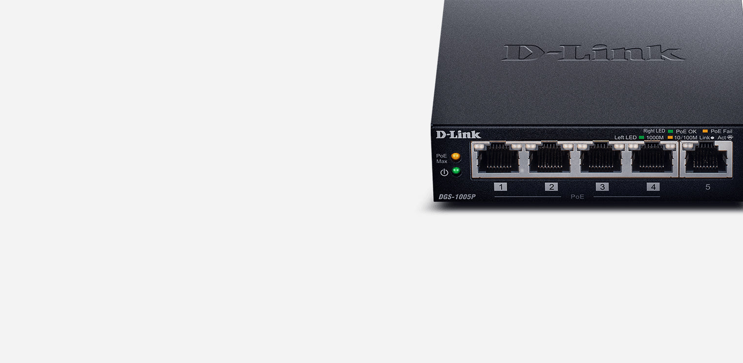 The compact design of the DGS-1005P allows placement in most locations, including those where space is at a premium. The desktop form factor provides everything you need to set up a new network or expand an existing network, while the fanless design ensures silent operation even in noise-sensitive areas such as workstations and meeting rooms.